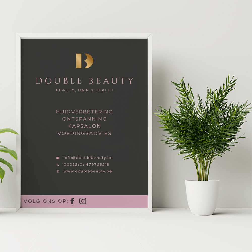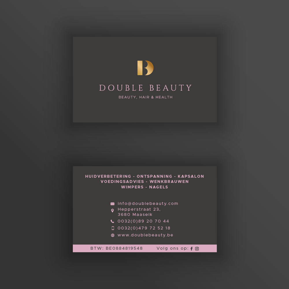 Double Beauty is een elegant schoonheidsinstituut in Maaseik, ontstaan uit de unieke samenwerking tussen moeder en dochter. Deze bijzondere band vormt de kern van het merk en komt subtiel tot uiting in het logo: een verfijnd monogram waarin de letters D en B sierlijk in elkaar verweven zijn. Het beeldelement is uitgevoerd in een luxueuze goudtint, wat direct een gevoel van exclusiviteit en klasse oproept.Voor de visuele identiteit is gekozen voor een diepe, rijke achtergrondkleur die balanceert tussen donkerbruin en zwart. Deze donkere basis creΓ«ert een warme, chique uitstraling en laat de gouden accenten extra tot hun recht komen. Als frisse tegenhanger is een zachte roze tint toegevoegd als accentkleur, wat zorgt voor een vleugje vrouwelijkheid en moderniteit.Het resultaat is een unieke en harmonieuze kleurencombinatie die niet alleen stijlvol oogt, maar ook perfect aansluit bij de filosofie van Double Beauty: hoogwaardige schoonheidsbehandelingen in een omgeving die luxe, vertrouwen en verfijning uitstraalt.